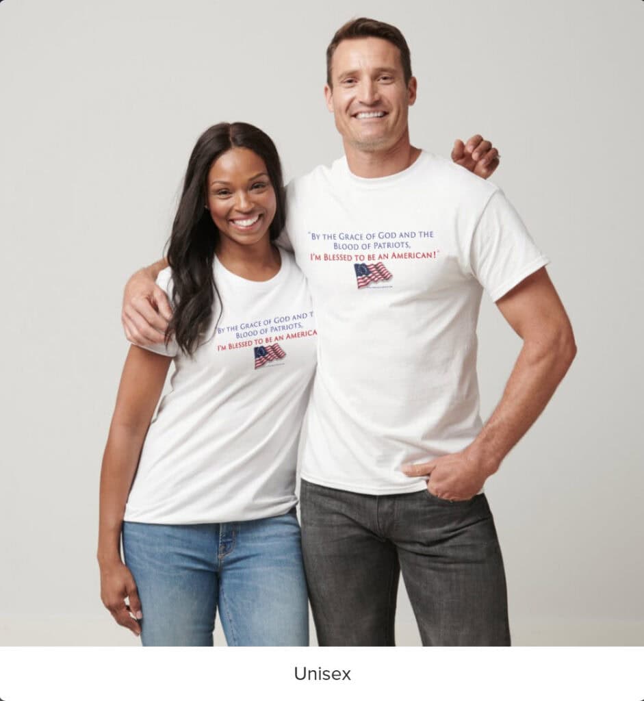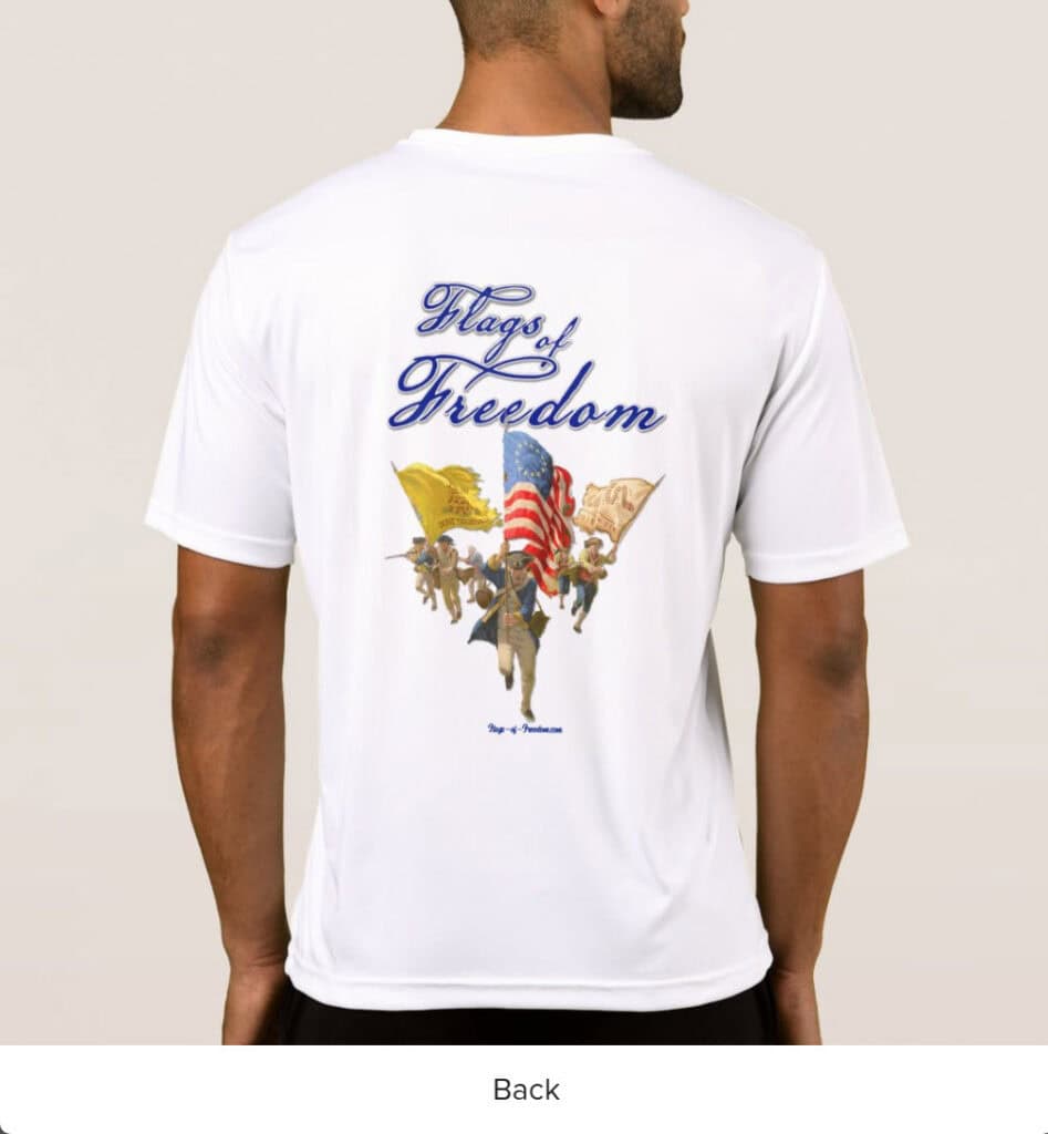 Show the world you’re thankful for your “Gift of Freedom!” Get this beautiful new Flags of Freedom T-shirt with the author’s patriotic quote of gratitude on the front, and the striking “3 Flags of Freedom” artwork on the back.